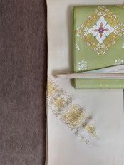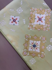 ひわ色の袋帯です。クリスマスや年末年始のイベントから春先のお祝いシーズンなどにもぴったりな華やかで合わせやすい帯。