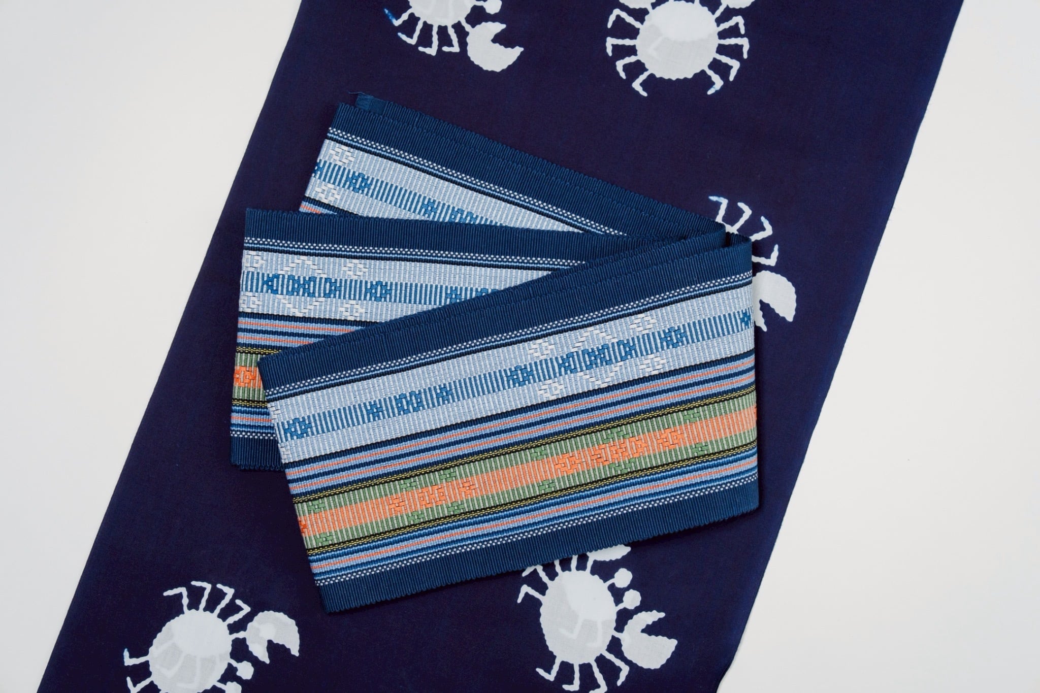 読谷山(よみたんざん)ミンサーは、沖縄県読谷村で生産される、綿糸(ミン)で織られた幅の狭い(サー)帯で、国の伝統的工芸品です。竹串で経糸を拾う「グーシバナ技法」による浮織が特徴で、植物染料(琉球藍など)を用いた色とりどりの紋様が魅力です。この夏のお供に。(浴衣は参考商品です)