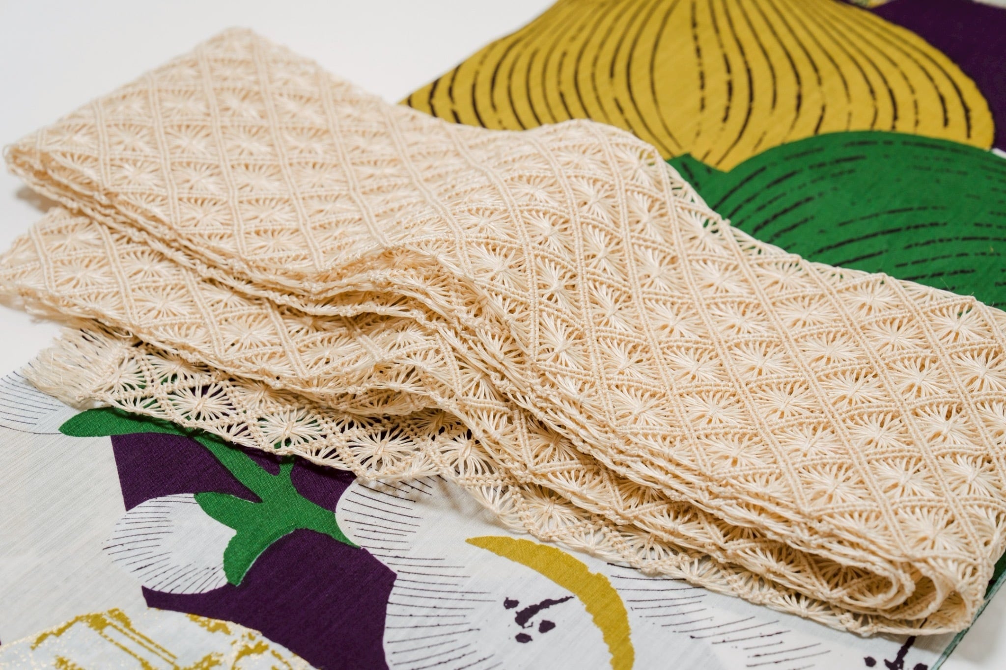 「通風段文(つうふうだんもん)」は、二重組織による立体的な陰影が、無地の自然布にはない奥行きを与えます。